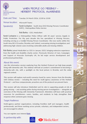 Following the publication of the Missing People Organisation's report - "Missing from Hospitals, Health and Care Settings: An Analysis of Reports to Prevent Future Deaths and Safeguarding Adult Reviews", this webinar will include the key findings and messages from the report. The session aims to provide valuable insights, preventative strategies, and recommendations for improving health, care, and police responses when people are missing. The webinar aims to provide learning and information to support the prevention of future deaths and help participants consider how to improve services and safety nets for adults who might go missing.